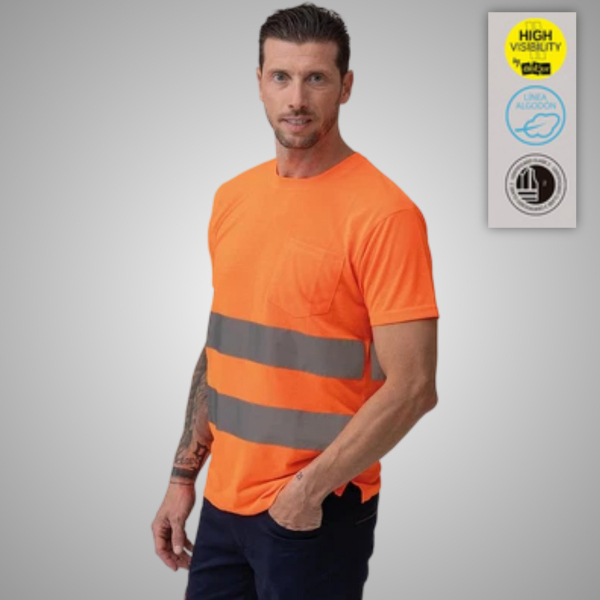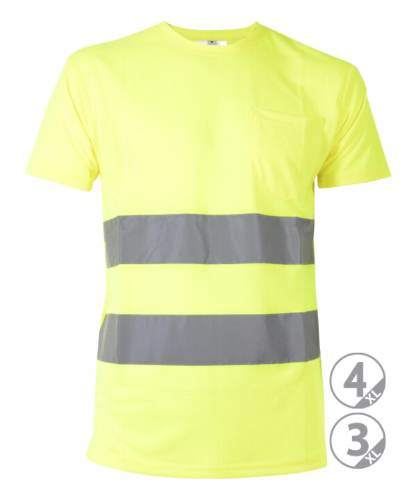 100% polyester coton touch, 160 gr, tricot uni Bandes réfléchissantes : 2 bandes réfléchissantes cousues sur le torse de 7 cm Norme :