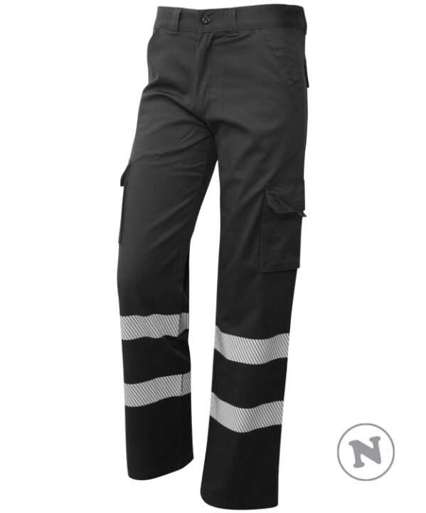 Pantalon long stretch à poches multiples avec deux bandes réfléchissantes thermosoudées sur le contour de chaque jambe, sous le genou, certifié 50 lavages
