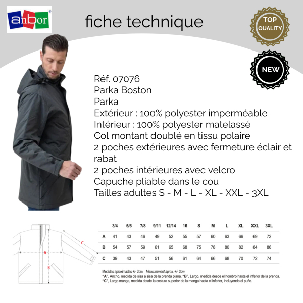 Matière contrastée: 100% polyester 280 g Matière fluo: 100% polyester 280 Traitement anti-boulochage sur la face externe Ourlet avec régulateurs pour ajuster la taille Manchette élastique Fermeture éclair complète Poches latérales zippées Bandes réfléchissantes: 2 bandes réfléchissantes cousues sur le torse et les manches
