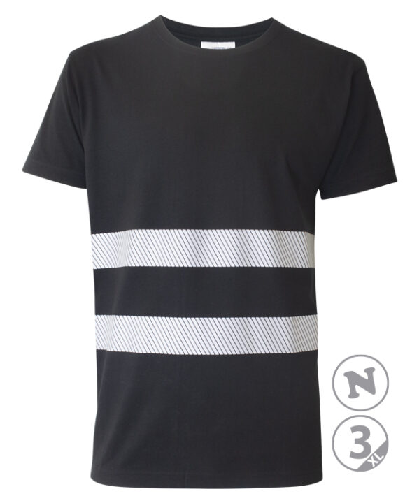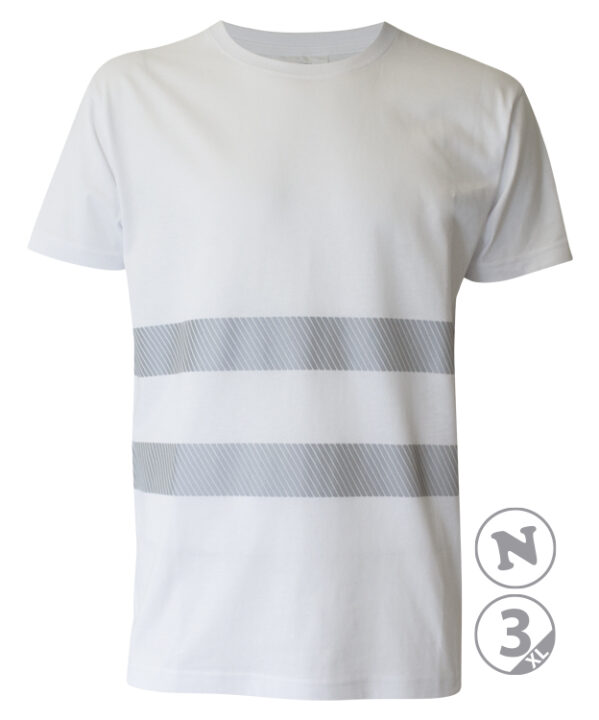 T-shirt à manches courtes et col rond, 100 % coton, jersey 160 g/m². Coutures doubles au col et aux épaules. Encolure en Lycra. Deux bandes thermosoudées discontinues sur le torse.
